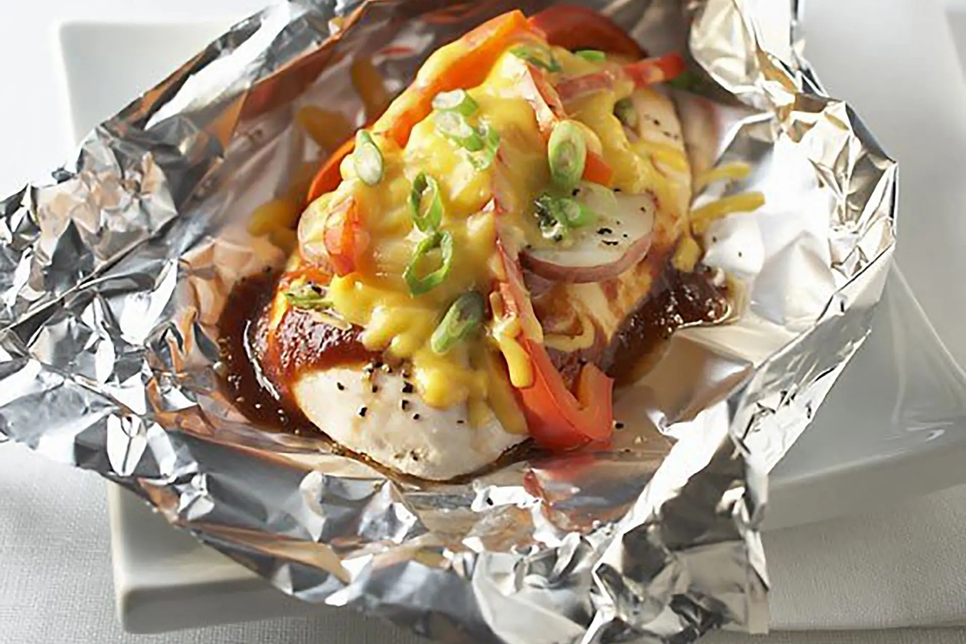 CHICKEN, POTATOES, PEPPERS, CHEESE AND A DASH OF BBQ SAUCE (We didn't add the onions) |